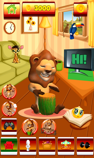 You must be curious to know what you can do with your top virtual hero? The lion will show you his rooms that are so beautifully decorated, it will take your breath away. Let’s come into his living room. If you look behind the couch you will see cute little giraffe. Tap the books to see a smiley face, he turns and jumps around. Check out a window, colorful toucan is here, touch him and he will sing to you. Our hero has musical talents, he knows to play wooden xylophone and drums. You will enjoy in the sounds he performs on balafon, listen carefully and you will be amazed. Let’s learn the letters together, just watch the tv screen. He owns a home gym where he exercises, and he is a proud owner of a treadmill where he can run or walk. It is important for the lion to stay in shape! So, making sure that he does not miss a single training. He has a wonderful bedroom where he can sleep and rest after a crazy day. The red bell is wake him up. Everything is magical in the savanna. Have a lot of fun together on the playground. He is very good at sports, and he adores jumping on the trampoline! On the tree you will see a eagle, if you tap him, he will fly away. Talk to the lion and he will listen, later he will be able to repeat your words. Play with this popular animal and he will show you everything that he can do! Tickle and slap your pet for fun, to see his reaction. He can dance, and he is ready to show your his moves. The coolest lion has a bathroom where he can take a bath, brush his teeth... And a towel for wiping. You must help your little hero to collect coins and unlock all the rooms, so it is finally time for fantastic mini games. Play Jumpy Lion, cross all platforms and try to achieve the maximum height. Open Pizza Defense and protect this delicious meal from the attack of nasty bugs. Beware of spiders and caterpillars but try not to hurt butterflies and ladybugs. They are your friends and will help you in your mission. In Lion Smash do not drop the hammer from your hands and hit this wild animals as soon as they come out of the pit. Play Lion Jump and just tap platform that you want your hero to jump on. He leads a very impressive life! What do you think? Grab your smartphone, download top talking lion game application, and get ready to have a lot of fun.