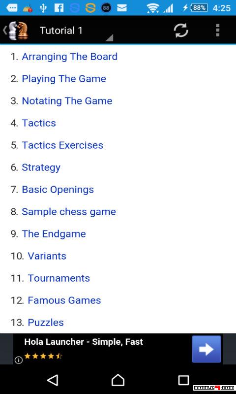 Free Chess Tutorials Android Application. It provides the basics of chess plus the best strategies to win this game. It is an excellent training choice for beginners who want to learn how to play chess and win. You need internet connection to watch these tutorials.