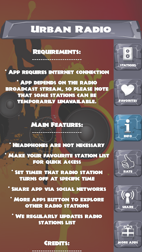 The lovely tunes of the most popular artists who are famous all around the globe will be so accessible to you now. It will be enough to download and install the latest ~Urban Radio~ and you will have the opportunity to enjoy the sensational beats of reggae, dancehall, and soca. One of the things that are going to help you organize your time is the chance to set a timer for any of the channels that you wish. Just adjust the time on your phone and the radio station will turn off. One of the famous branches is a mainstream urban and you will find the songs that belong to it in the best application.