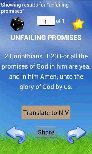 Unlike other bible promises apps, this does exactly what it says. Bible Promises is an offline app that contains almost all the promises in the bible - Abundant Grace, Knowledge, Riches, Forgiveness, Peace, Strength, Utopian life in heaven etc etc. It comes in multiple translations and many features. Credits to Pastor Samuel Asiedu. Main features: Personalize app - Change themes, font size and style, keep screen on/off etc Multiple translations - King James and New International Version Search for particular verses, words, sentences etc Add and manage favorite verses Share verse or passages on twitter, facebook, SMS etc Continue from last verse read Swipe finger across screen, enter numbers or press buttons to navigate App can be installed on SD card