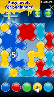 In Color Oil, your task is to fill the board with the same color oil. The game starts in the cell labeled S. Tap the buttons on the bottom to change the color of oil to match the surrounding cells. Do this repeatedly until all cells are of the same color.