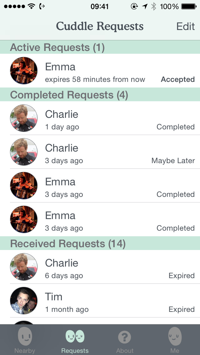 Cuddlr is a location-based social-meeting app for cuddling. Find people near you who are up for a cuddle. Have a cuddle with them. No pressure.