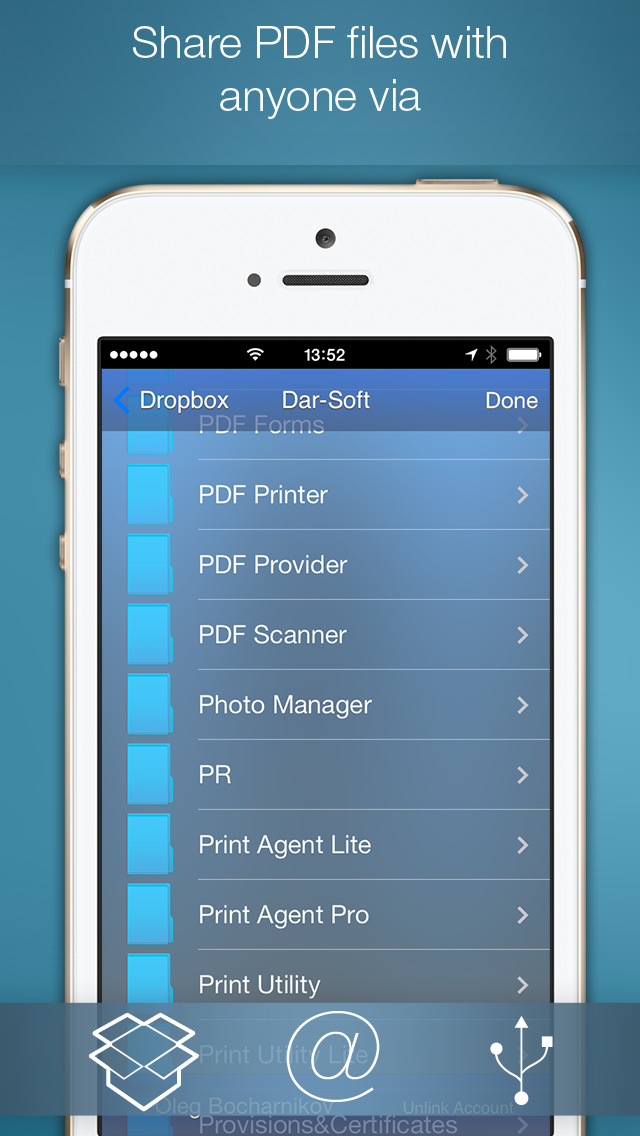 To organize and store your files, you can take advantage of an innovative file manager that features List and Collection Views. The latter offers an intuitive touch-friendly way to manage documents and perform most frequent operations. Also, you can send PDFs by e-mail, open in other apps and print to the wireless printer.