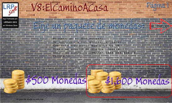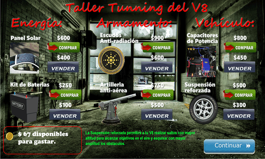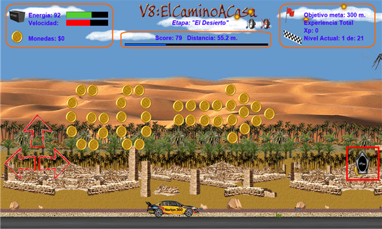 Adicionalmente recoge monedas en el Camino y ahorra energía para acumular más monedas, las cuales te servirán en el Taller para adquirir nuevo armamento o funcionalidades especiales para tu V8.