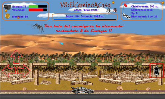 Controla el V8:ElCaminoACasa en contra de los insectos gigantes mutantes que se aproximan, dispara contra ellos tu bala eléctrica, pero también debes cuidar que la energía de tu V8 no se agote, para esto tendrás que ser muy hábil, ya que puedes saltar obstáculos o a los mismos insectos todo con el fin de llegar a la meta.