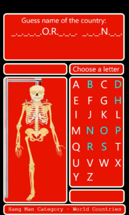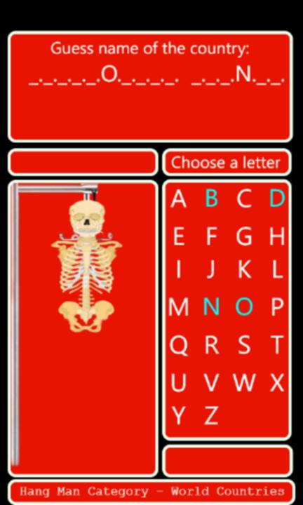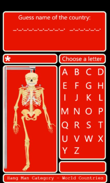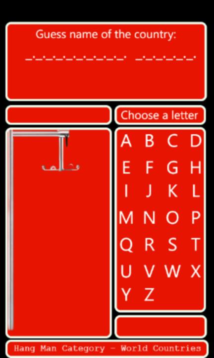 The classic game of hang man. The user has to guess the name of the countries. Blank spaces has are provided, as the user guess the right letter, the letter appears on the screen.