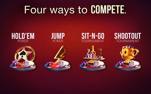 - Play casual Texas Hold ’Em or competitive Tournaments like Shootouts and Sit-N-Go.