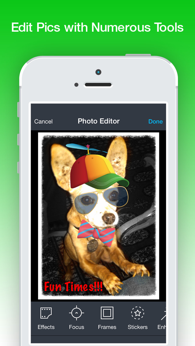 Many features such as cropping, rotating, writing on a pic, framing a pic and more! The edited pic will be saved as a new pic.
