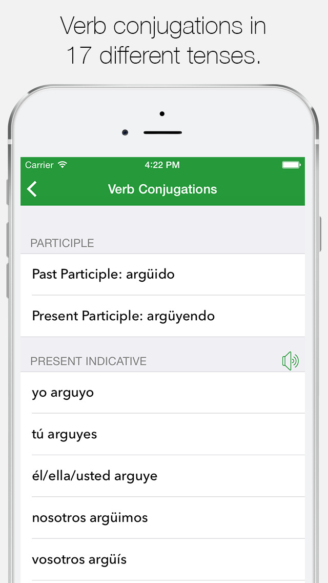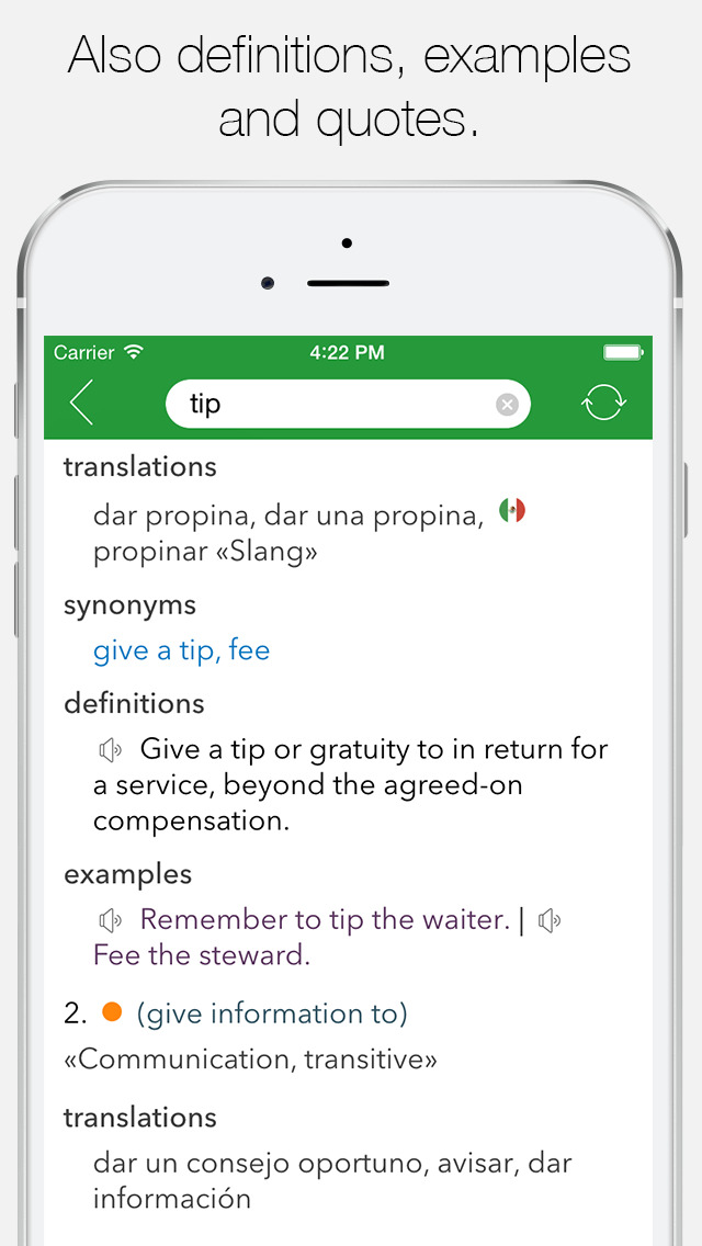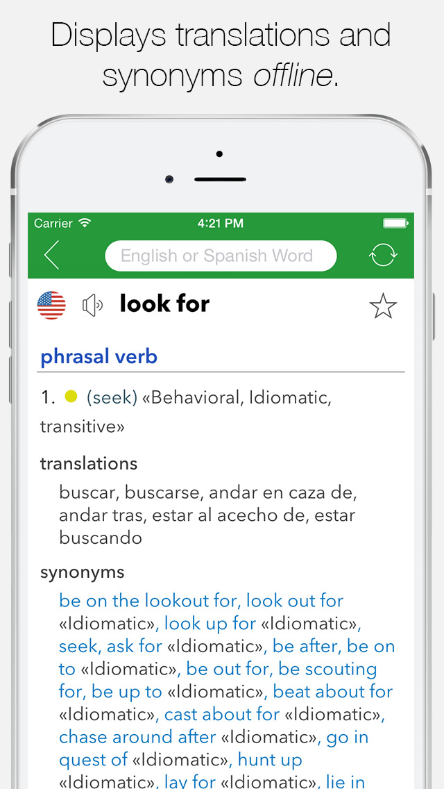 “This is a wonderful app that is intuitive, fast and astonishingly complete and up to date, including full, self-pronouncing conjugations with a choice of voices and dialects.†WORKS OFFLINE With over 718,000 entries, 524,000 translations, 558,000 synonyms, 98,000 definitions and 40,000 examples, voice feature and a huge collection of idiomatic expressions in both languages.