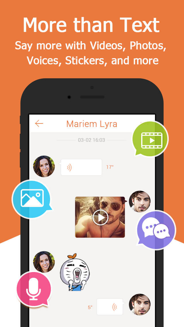 - Express yourself with Videos, Photos, Voices and Stickers without Limit.