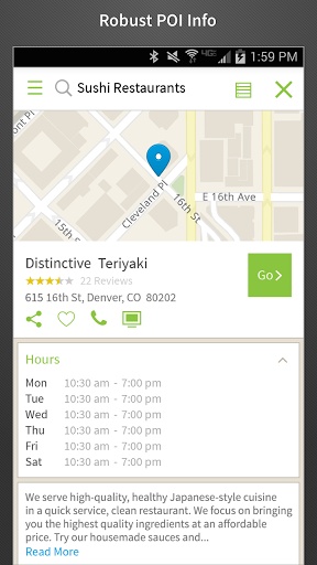 • Advanced search uses your contacts, recent searches, top categories, and nearby points of interest to help you find your destination faster.